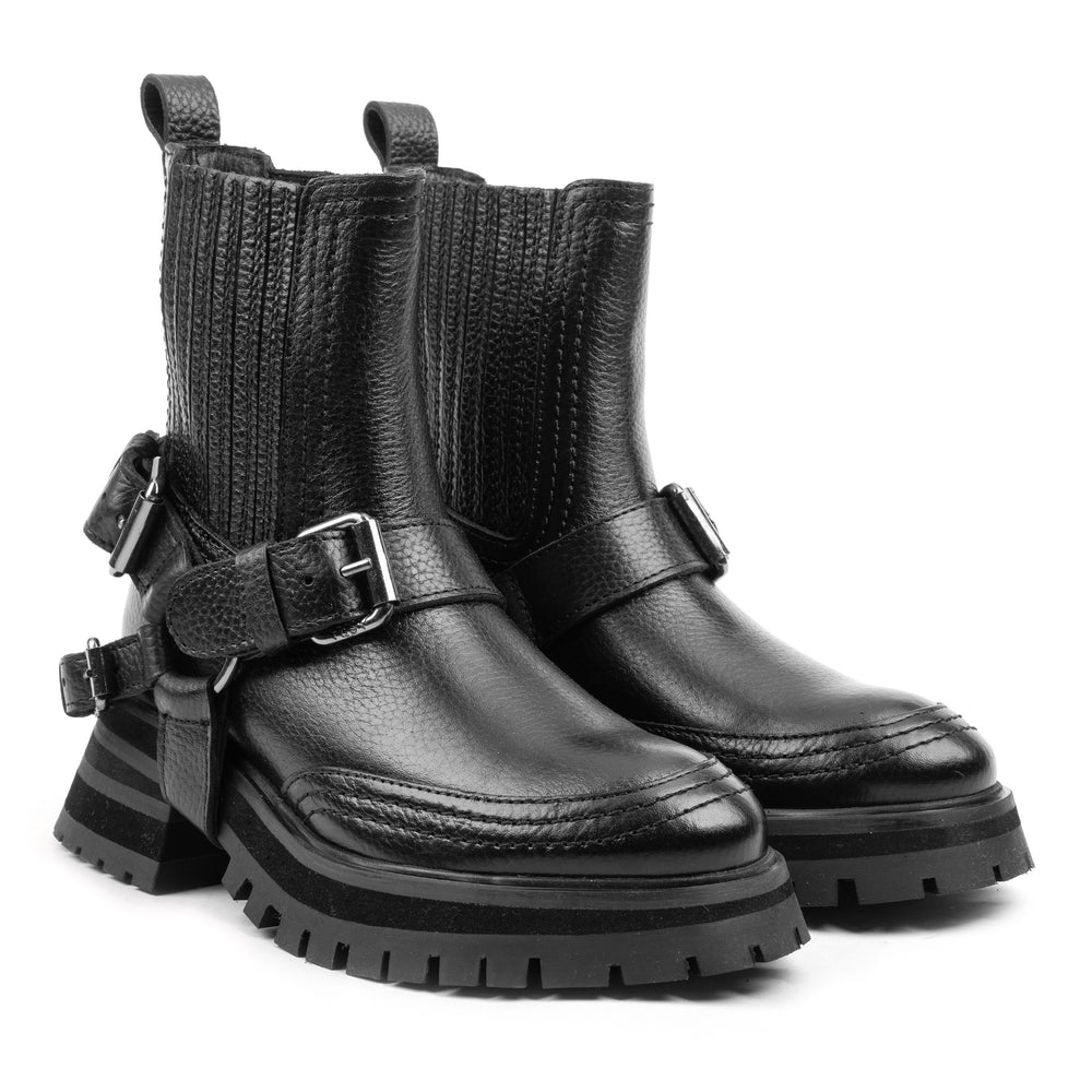Descoperă cizmele Asra Ladies Bruce, o alegere perfectă pentru femeile care doresc să îmbine stilul robust cu eleganța contemporană. Aceste cizme cu toc gros sunt confecționate din piele neagră de înaltă calitate, având o talpă profilată pentru aderență superioară. Interiorul și branțul din piele neagră asigură un confort deosebit, în timp ce detaliile de tip harness cu accesorii din metal argintiu adaugă un plus de rafinament. Cizmele Asra Ladies Bruce sunt ideale pentru a completa orice ținută modernă, oferind un look chic și durabil. Alege aceste cizme pentru un stil îndrăzneț și sofisticat.