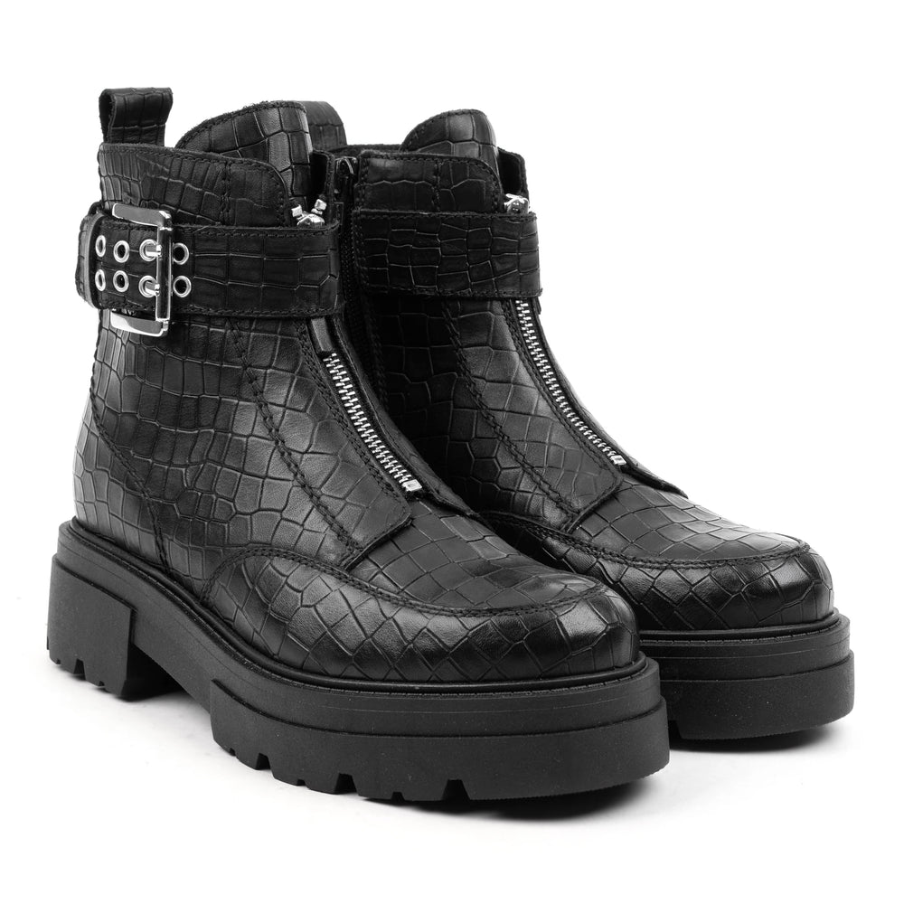 SHARI ANKLE ZIP Black Embossed